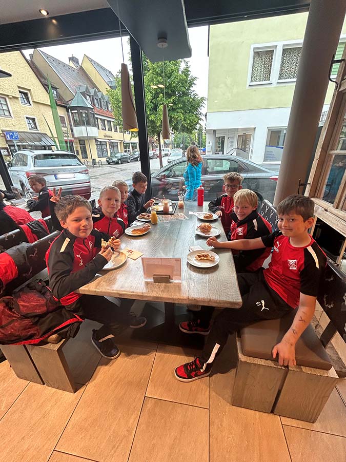 Die Jungs hatten Spaß und brachten Fußballstimmung ins Café. Nach der Stärkung machte sich das Team auf zum TSV Gelände für das Heimspiel gegen Eckersmühlen. Der Regen konnte der guten Laune nichts anhaben. Vom gemeinsamen Cafébesuch über einen Lauf zum TSV Gelände zu einem Spiel mit Teamgeist, das in einem 4:0 für den TSV Feucht gipfelte- ein rundum gelungener Vormittag!
